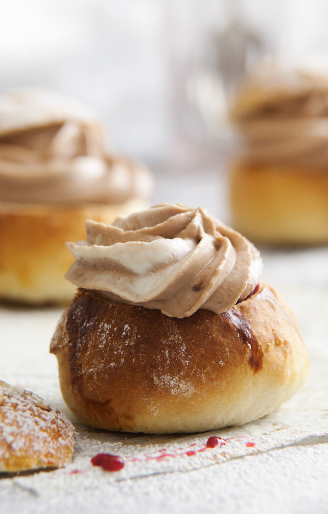 Laskiaisen paras pulla on nutellapulla: pyöreä ja pehmeä herkku, jonka sisällä on suklaista kermavaahtoa ja vadelmaa. Tätä keskitalven unelmaa voi syödä muulloinkin kuin laskiaisena, sillä se on niin hyvää!