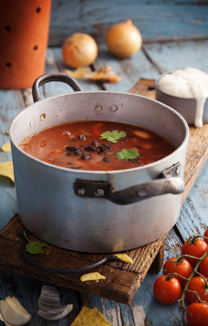 Den angenämt starka bönsoppan utvecklas från vardags- till festmat om den serveras med nachos och crème fraîche.