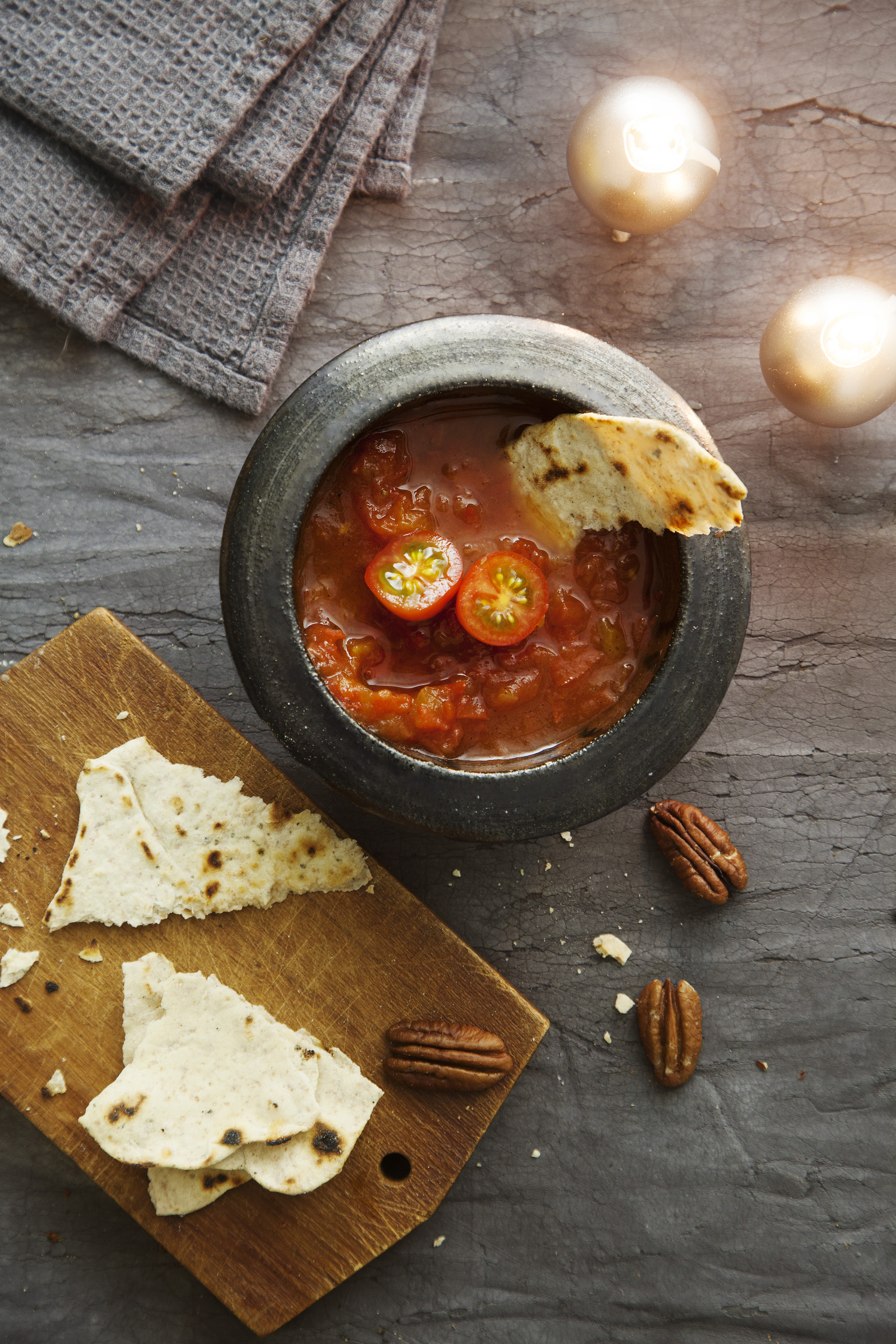 Lillajulfestens överraskning är ingalunda jultomten utan tomaten. En tomatkompott kryddad med kardemumma, kanel och vanilj är en supergod dippsås och kommer att få massor av beröm. Servera kompotten med t.ex. basilikabröd.